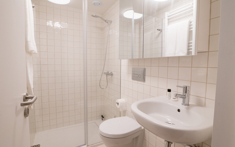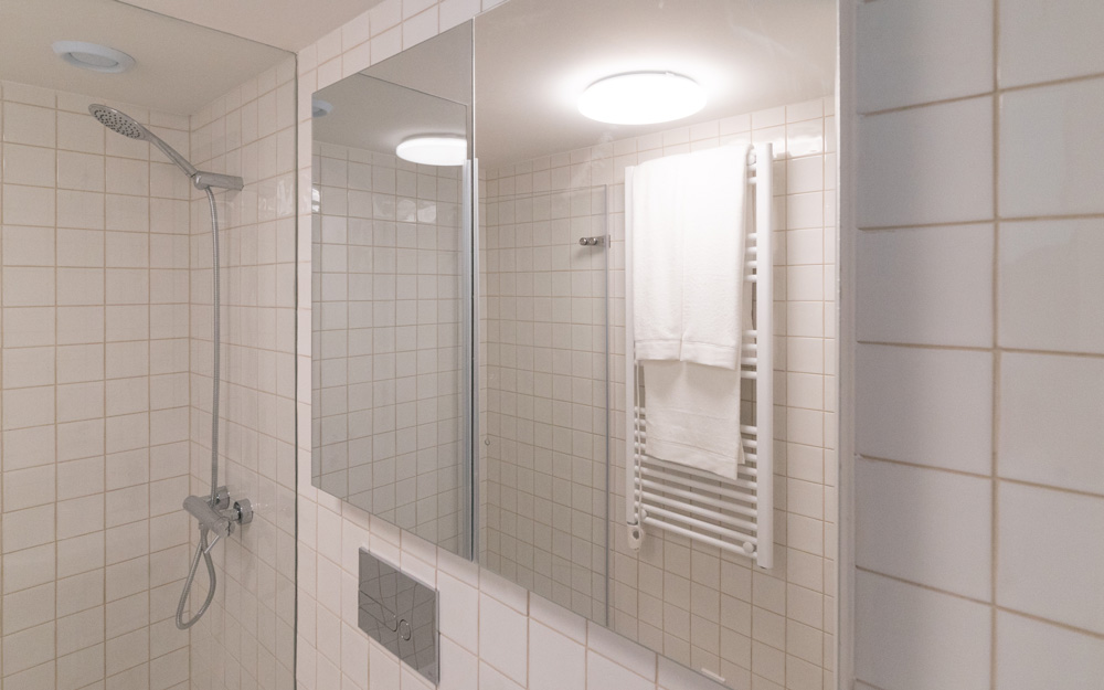 Casa de banho privativa com toalhas, produtos de higiene pessoal de cortesia, secador (mediante pedido prévio) e suporte de toalhas com aquecimento.