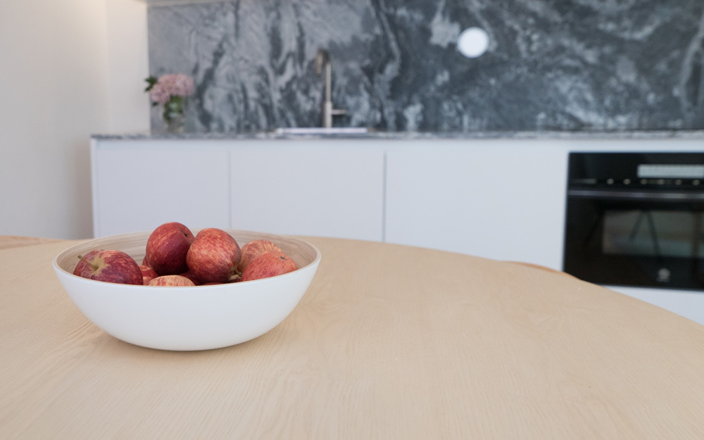 Cozinha totalmente equipada com eletrodomésticos, utensílios, máquina de café Nespresso e mesa de refeições.